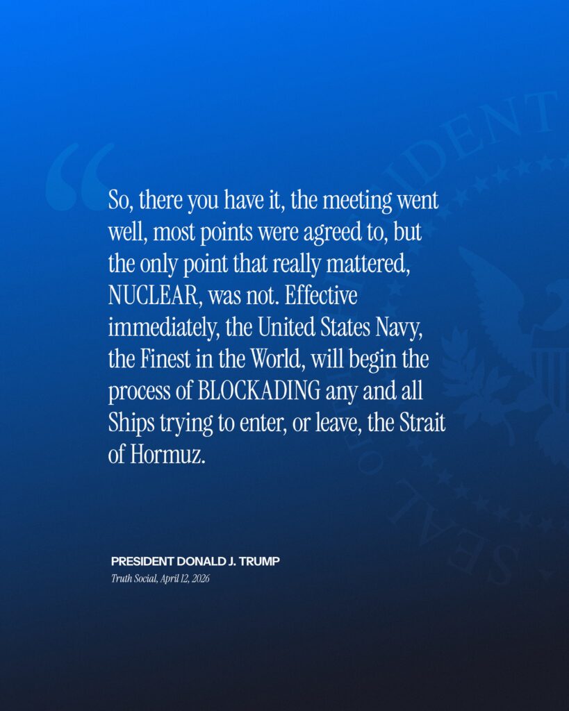 In a dramatic escalation following the collapse of high-stakes US-Iran peace negotiations in Islamabad, US President Donald J. Trump has ordered the US Navy to impose an immediate blockade on the Strait of Hormuz. “Effective immediately, the United States Navy, the Finest in the World, will begin the process of BLOCKADING any and all Ships trying to enter, or leave, the Strait of Hormuz,” Trump declared on Truth Social on Sunday, April 12, 2026.
