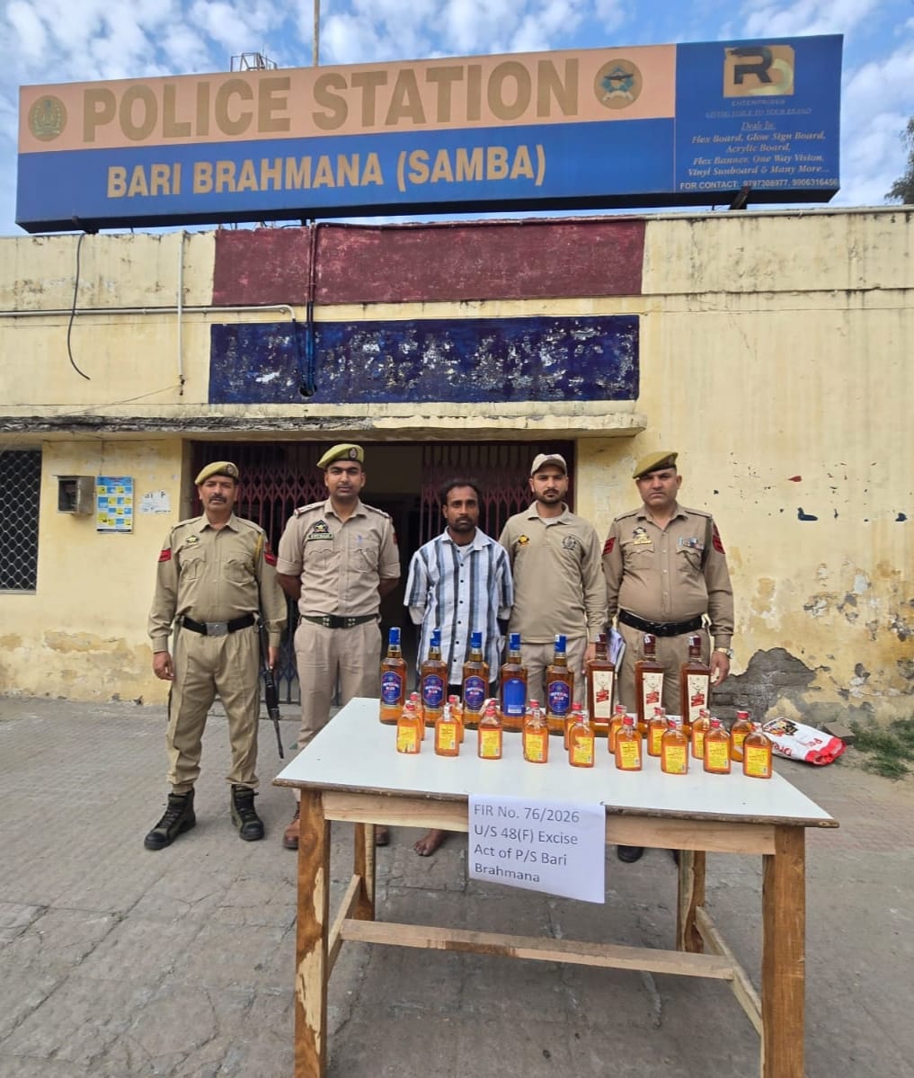 Samba: March 10, 2026: Continuing its drive against the sale of illicit liquor in the district, Samba Police has arrested a bootlegger and recovered 27 bottles of illicit liquor from his possession in the jurisdiction of Police Station Bari Brahmana.